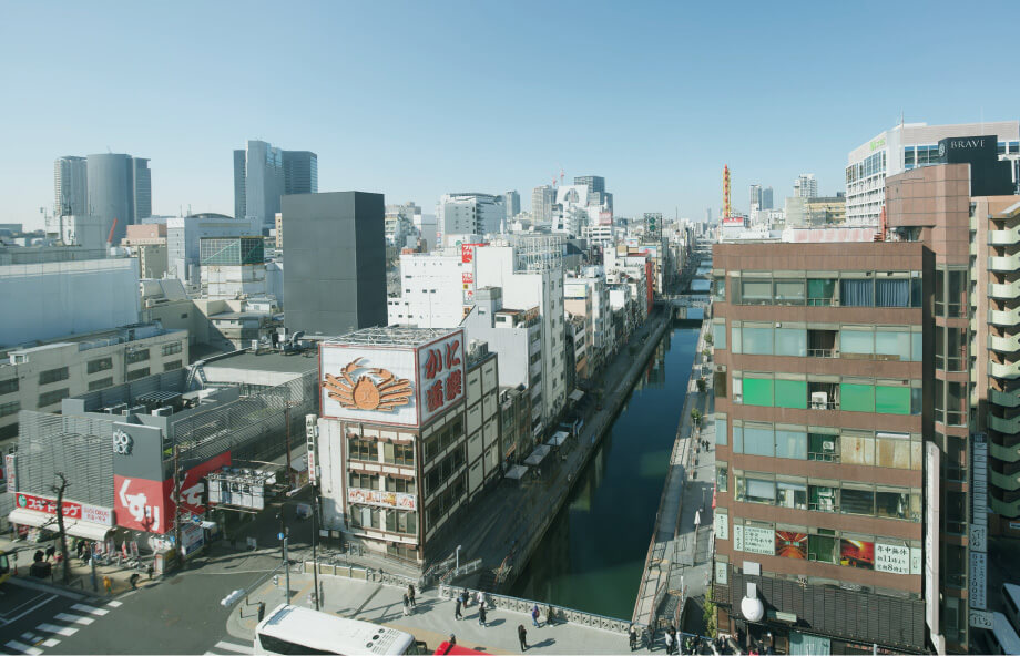 バレルサウナのパノラマガラスからは、大阪難波・道頓堀川を一望できます。